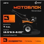 Оснащен бензиновым 4-х тактным двигателем с воздушным способом охлаждения, мощностью 7 л.с. Запуск мотора производится с помощью ручного стартера. Мотоблок поможет производить различные работы в сельском и коммунальном хозяйстве.