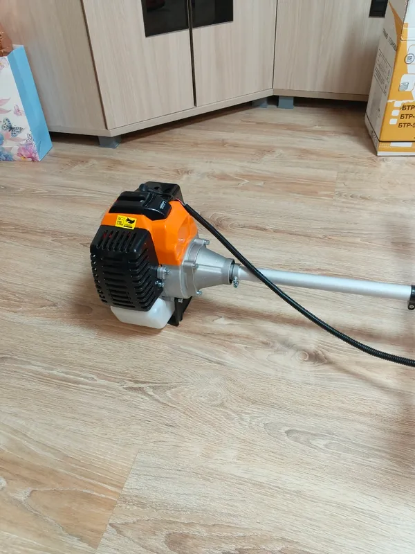 Бензиновый триммер оснащён двумя режущими элементами: леской и ножом, при необходимости можно заменить один элемент другим. Также триммер подходит для стрижки газонов, подрезания негустых кустов, работ в поле и др.