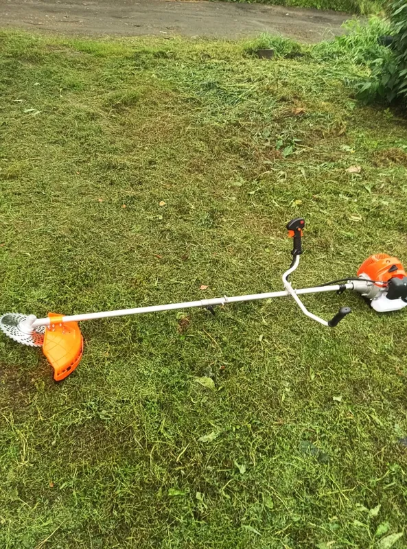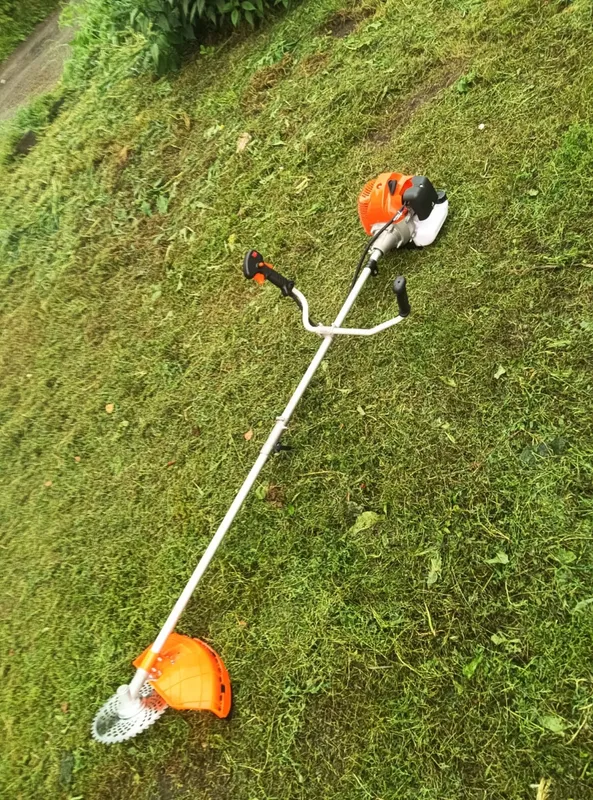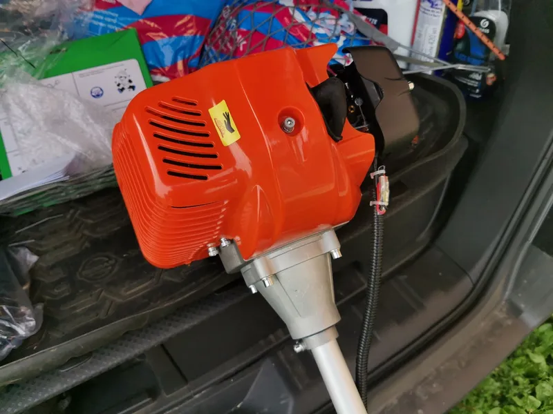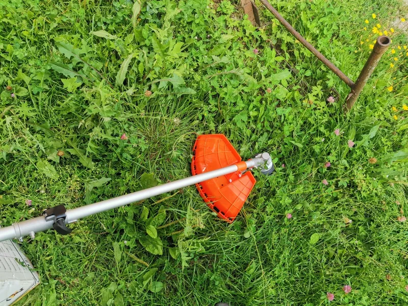 Бензиновый триммер оснащён двумя режущими элементами: леской и ножом, при необходимости можно заменить один элемент другим. Также триммер подходит для стрижки газонов, подрезания негустых кустов, работ в поле и др.
